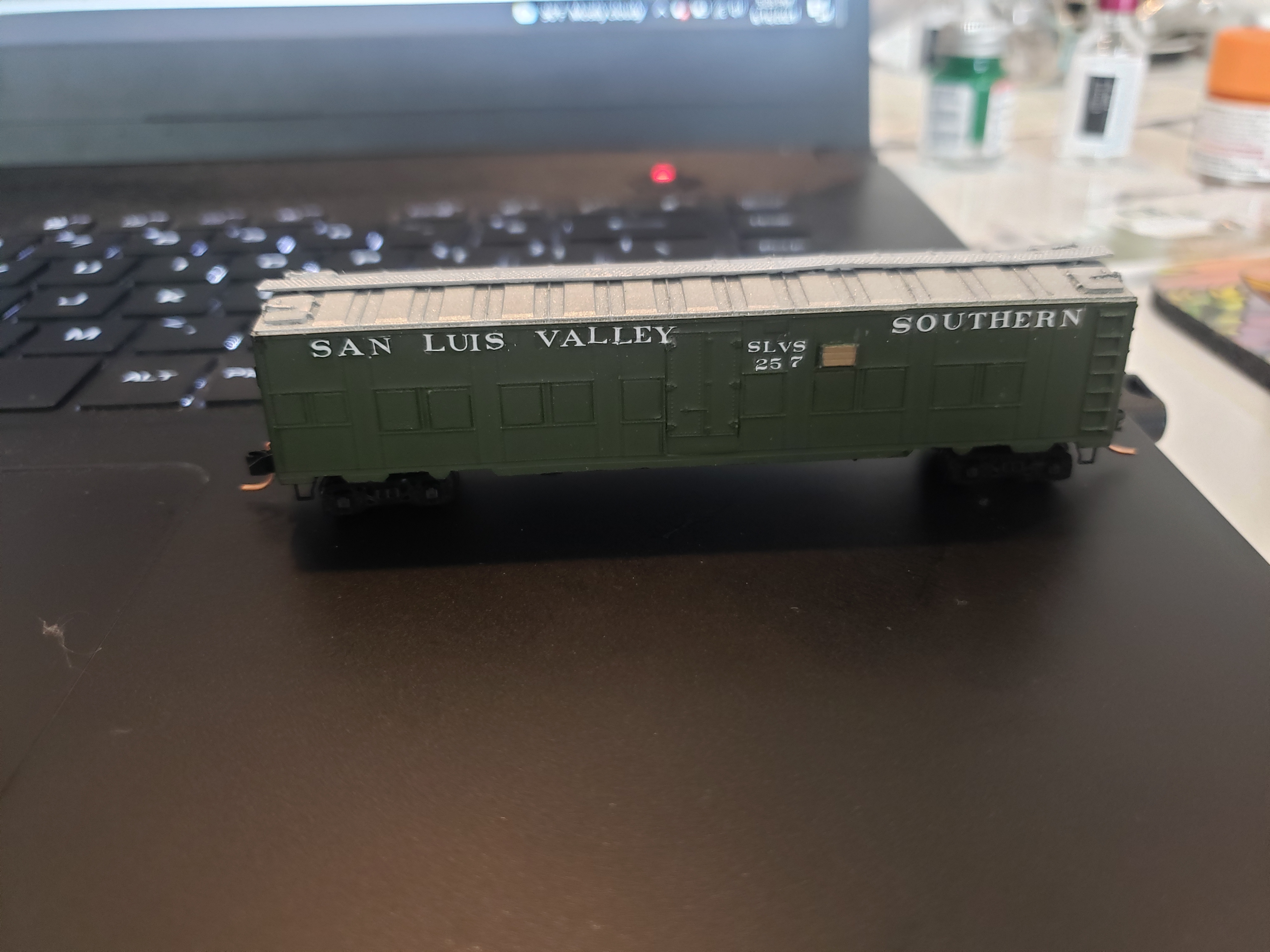 As a project this once again started with a Skytop Models cast resin shell. This was purchased at the same time as the SLVS D504 Crandall shell. The shell fits on the existing Micro-Trains troop sleeper chassis with no modification. As these cars are based on the REA cars, I painted it close to a pullman green with a silver roof to match the REA fleet. Decals are off the shelf and each letter was hand placed. At the time I had no real idea where I was going to take the SLVS history and these were meant to stear it towards a life simmilar the SLC. As such I would need a small fleet, around 10 or so cars, to complete this vision. However, with the closure of Skytop Models I no longer had an easy source of these pre-modified cars. Having bought a troop sleeper to steal the chassis I had a shell lying around with which I could experiment. Eventually building a second reefer car. This I painted in silver to match the MoW design elements of the DRGW which had close ties to the SLVS since the beginning. Ladders, doors and ice hatches for this car came from a intermountain 40ft reefer kit that I dissasembled for parts. The windows were blanked out with styrene and the end doors sanded off to match the protoype car ends. Decals came from a MoW decal set. Currently it still needs custom SLVS decals but as far as the railroad needs its ready to roll on the main.