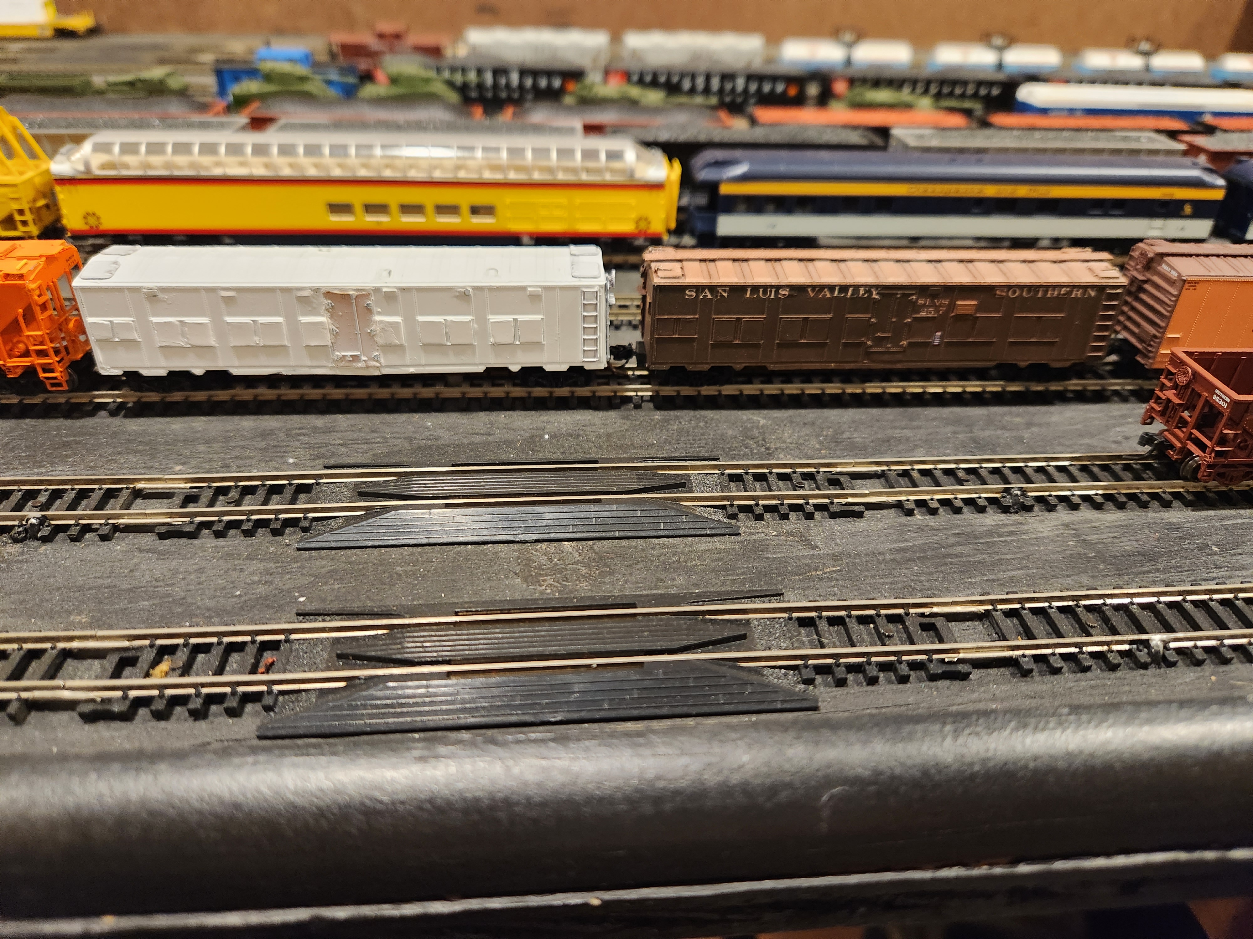 During WW2, the US Army had a fleet of cars built by Pullman for the transport of troops across the country. These Pullman Troop Sleepers were built more like a box car than any passenger car and rode on special Allied Cushioned trucks. Post war many of these cars were sold off to railroads for various different uses. Some become Cabooses, some became MoW lodging to replace bunk cars that were built before 1900, and even still others became various express and baggage cars. One example of such was the Railway Express Agency conversions. All side windows were blanked over and the ends were blanked. The side doors were replaced with a standard 40ft reefer door assembly and ladders on the ends of the car. Up top, they added four ice hatches and a roof walk. The trucks were changed out from the troublesome Allied trucks to a more standard ASF freight truck design. The SLVS aquired a small fleet of thse cars in the early 70s as part of a joint purchase with the San Luis Central, who bought standard REA express reefers. These cars were used first in lettuce shipping and later in potato service before being retired from an active role in 1997. Most of the cars were scrapped, sold, or used as storage sheds by 2000. A few of the cars have survived on the rails, usually running with MoW trains as tool cars. With the aquisition of the San Luis Rio Grande these cars lives has been extended in this tool car service to serve the now expanded railroad.